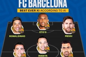 體育資訊12月6日訊 Onefootball社媒曬AI評出的巴薩隊史最佳陣容,梅西、小羅、埃托奧組成鋒線三叉戟。