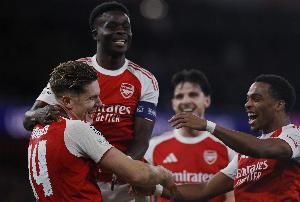 阿森納首發陣容:拉亞、本-懷特、廷伯、因卡皮耶、卡拉菲奧里、蘇維門迪、賴斯、厄德高、薩卡、埃澤、梅里諾。