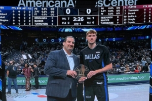 體育資訊12月7日訊 獨行俠主場迎戰火箭,狀元弗拉格賽前領取月最佳新秀獎。