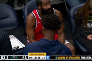 幸無大礙!哈登三分被戈貝爾墊腳犯規 裁判回看后給后者一級惡犯