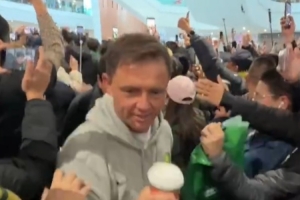 今日國安隊搭乘航班返回北京,眾多國安球迷前來接機,現場還唱響了國安隊歌《國安永遠爭第一》。