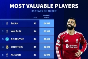 體育資訊12月7日訊 德國轉會市場統計了年齡33+球員的身價,并列出榜單,薩拉赫4500萬歐居首,梅西1800萬歐第七。