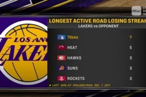 賽前湖人轉播商曬出一組數據,列舉湖人目前面對不同對手的最長客場連敗紀錄: