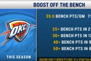 本賽季的雷霆有13場比賽至少2名替補球員得分10+,3場比賽至少3名替補得分10+。