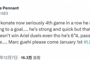 彭南特寫道:“我真是受夠科納特了,這已經是他連續第四場比賽犯錯導致失球了……他雖然身體強壯速度快,但僅此而已,技術簡直糟糕透頂,明明身高1米93卻連空中對抗都贏不了,傳球水平跟業余聯賽球員沒兩樣,格伊請務必在1月1日加盟利物浦。”