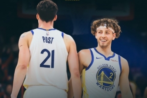 賽后勇士官方曬出本場贏球海報,封面人物是波杰姆斯基和波斯特。