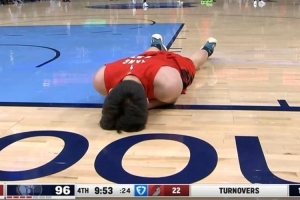 楊瀚森遭遇包夾被埃迪打到面部痛苦倒地 在地上躺了半天沒起來