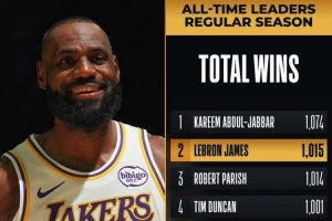 據(jù)NBA官方統(tǒng)計(jì),這是詹姆斯生涯第1015場(chǎng)常規(guī)賽勝利,超越“酋長(zhǎng)”帕里什,升至NBA歷史第二位,僅次于“天勾”賈巴爾的1074場(chǎng)。