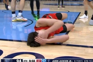 "倒地不起之后,裁判并沒有吹停比賽。根據規則,在這種情況下比賽通常不會被叫停。我記得卡梅隆·安東尼曾經也有過類似的情況,他在一次比賽中臉部被擊中后倒地,幾乎整整一分鐘的比賽時間內都躺在地上,期間雙方進行了多次攻防轉換。這時除非教練叫暫停,否則比賽一般不會因此中斷。有時候裁判會吹停比賽,但如果球員沒有妨礙到比賽進行,他們通常不會這么做。像這樣的情況,比賽還是會繼續進行,直到出現自然的停頓或者有人叫暫停。如果沒有的話,裁判也沒有義務必須吹停比賽。我并沒有覺得裁判在操控比賽。”