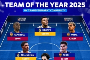 體育資訊12月8日訊 德轉列出經投票選出的2025年度最佳陣,姆巴佩、亞馬爾、貝林厄姆、佩德里在列。