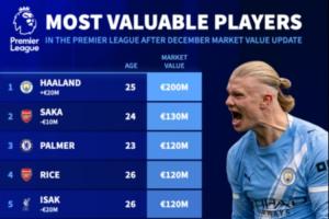 體育資訊12月09日訊 今日德轉更新新一期英超球員身價,哈蘭德2億居首,伊薩克降至1.2億,維爾茨降至1.1億。