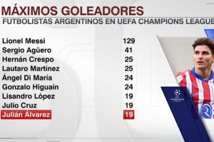 體育資訊12月10日訊 在本輪歐冠馬競3-2擊敗埃因霍溫的比賽中,阿爾瓦雷斯破門。這也是他在歐冠第19球,以下為阿根廷球員在歐冠射手榜: