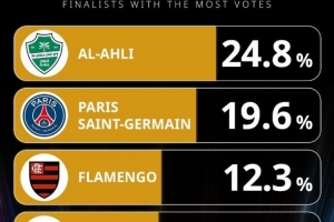 體育資訊12月10日訊 環(huán)球足球獎公布了2025年最佳男足俱樂部的投票情況,目前吉達(dá)國民24.8%領(lǐng)跑,巴黎、弗拉門戈二三位。