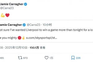 體育資訊12月10日訊 利物浦1-0客勝國米,卡拉格轉發了賽前談薩拉赫的推文,并配文:拿下!