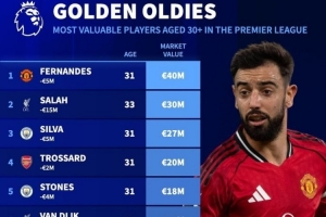 體育資訊12月10日訊 德國轉會市場統計了英超30歲以上球員身價排名,曼聯隊長布魯諾·費爾南德斯排名第一。