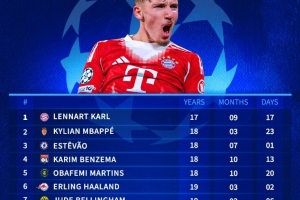 體育資訊12月10日訊 在本輪歐冠拜仁3-1擊敗葡體的比賽中,卡爾破門,也成為歐冠最年輕連續3場進球球員。以下為自92/93賽季歐冠改制以來最年輕連續3場破門紀錄榜: