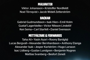 中前場:塔哈-阿里(馬爾默)、阿亞里(布萊頓)、巴德吉(巴薩)、貝里瓦爾(熱刺)、伯恩哈德森(荷爾斯泰因基爾)、伊蘭加(紐卡)、伊薩克(利物浦)、卡爾斯特羅姆(烏迪內斯)、雨果-拉爾森(法蘭克福)、利德伯格(達姆施塔特)、倫德格倫(加爾斯)、本杰明-尼格倫(凱爾特人)、斯萬伯格(沃爾夫斯堡)、澤尼利(埃弗斯堡)