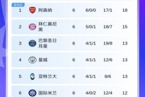 6輪過后,阿森納6戰全勝領跑,基本鎖定前8席位,曼城升至第4,本菲卡兩連勝靠近附加賽區,重燃晉級希望。