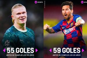 據統計,25歲的哈蘭德在歐冠已打進55球,26歲前歐冠進球數僅次于梅西(59球),而哈蘭德明年7月21日才滿26歲。