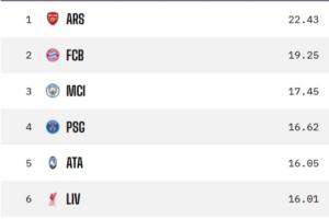 體育資訊12月11日訊 歐冠結束聯賽階段前6輪的爭奪,數據機構Opta預測了歐冠聯賽階段的最終排名。