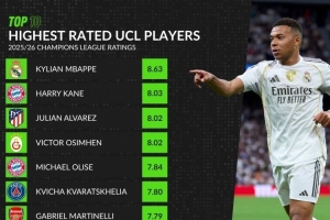 體育資訊12月11日訊 WhoScored統計了本賽季球員在歐冠比賽中的場均評分,并列出評分最高榜單,姆巴佩8.63分居首,凱恩8.03分次席。