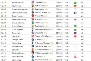 據估計,全球共有113名青少年球員身價至少達到1000萬歐元,他們效力于25個聯賽和80家俱樂部。 其中,英超聯賽球員人數最多(23人),其次是德甲聯賽(16人)和法甲聯賽(11人)。