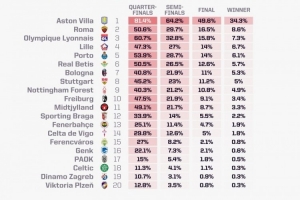體育資訊12月12日訊 opta在當(dāng)?shù)貢r(shí)間12月11日對本賽季歐聯(lián)杯形勢進(jìn)行了新的預(yù)測,阿斯頓維拉奪冠概率達(dá)到34.3%,羅馬8.6%第二。