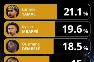 體育資訊12月12日訊 環球足球獎公布了年度最佳前鋒的投票情況,亞馬爾21.1%領跑。