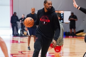 火箭官方發布了球隊訓練照,全員狀態輕松,杜蘭特眼神專注。