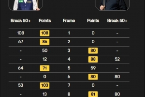 全場(chǎng)比賽,斯蒂芬-馬奎爾打出五桿50+(52、80、80、66、96),江俊打出一桿108分和四桿50+(67、64、53、58)