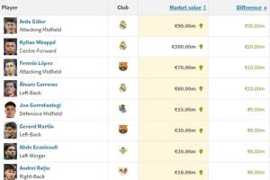 體育資訊12月12日訊 德轉更新西甲身價,漲幅排行中,居萊爾以3000萬歐的漲幅位列第1,姆巴佩漲2000萬歐第2。