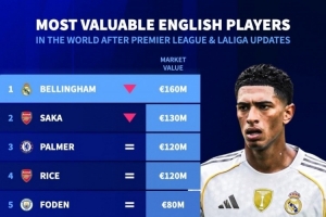 體育資訊12月12日訊 德國轉會市場更新了英超、西甲球員的身價,并列出英格蘭球員身價排名,貝林厄姆1.6億歐居首。