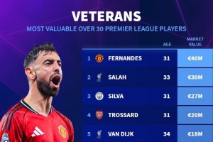 體育資訊12月13日訊 德國轉會市場列出了英超年齡30+球員身價排名,B費居首,薩拉赫次席。