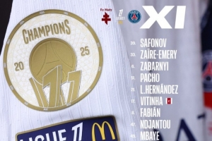 巴黎首發(fā):39-薩福諾夫、33-扎伊爾·埃梅里、6-扎巴爾尼、51-帕喬、21-盧卡斯·埃爾南德斯、17-維蒂尼亞、8-法比安·魯伊斯、47-恩賈恩圖、49-姆巴耶、9-貢薩洛·拉莫斯、19-李剛?cè)?/strong>