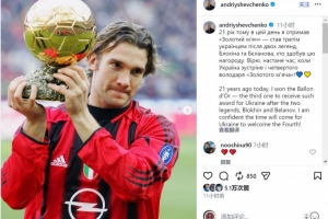舍甫琴科社媒曬出自己與金球獎(jiǎng)杯的合照,配文:“21年前的今天,我贏得金球獎(jiǎng),成為繼布洛欣和別拉諾夫之后,第三位獲得這一獎(jiǎng)項(xiàng)的烏克蘭球員。我相信烏克蘭終會迎來第四位金球獎(jiǎng)得主!”