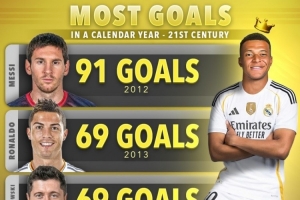 體育資訊12月15日訊 西甲第16輪比賽,姆巴佩破門,皇馬客場2-1擊敗阿拉維斯。據Score90統計,姆巴佩2025年打進63球,排名本世紀自然年進球榜第四位。