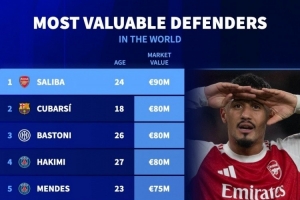 體育資訊12月15日訊 德國轉會市場列出了后衛身價排名,薩利巴9000萬歐居首。