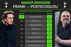 體育資訊12月15日訊 熱刺在本賽季英超高開低走,whoscored也對比了新帥弗蘭克本賽季前16輪和前任澳波上賽季前16輪的關鍵數據,弗蘭克完敗。