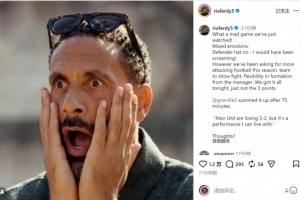 曼聯名宿費迪南德社媒曬出自己一臉驚訝的照片,并寫道:“我們剛剛看了一場多么瘋狂的比賽!心情復雜。以防守球員的身份來說——我(要是還在場上)肯定會大喊大叫!”