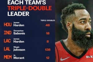 體育資訊12月16日訊 國外自媒體Enjoy Basketball統(tǒng)計了NBA各隊隊史上拿到三雙最多的球員。