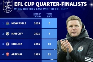 體育資訊12月16日訊 英格蘭聯(lián)賽杯八強(qiáng)戰(zhàn)即將開戰(zhàn),《轉(zhuǎn)會市場》也統(tǒng)計了八強(qiáng)球隊(duì)上次在聯(lián)賽杯奪冠距今的時間。