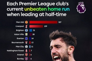 據(jù)英超官方統(tǒng)計(jì),曼聯(lián)延續(xù)著聯(lián)賽主場(chǎng)半場(chǎng)領(lǐng)先全場(chǎng)不敗的紀(jì)錄,場(chǎng)次達(dá)到327場(chǎng)。