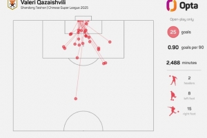 25 – 卡扎伊什維利本賽季在運動戰中攻入25粒進球,刷新自有紀錄以來(2012年),任一球員單賽季中超運動戰進球新高。