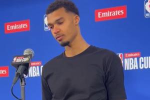 賽后發布會,文班接受采訪,第一個問題他眼眶泛紅全是淚水,用哭腔說著:“對不起,我今天失去了一位親近的人。”