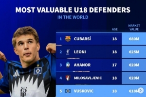 體育資訊12月17日訊 《轉會市場》統計了當前U18后衛身價情況,庫巴西以8千萬歐元斷崖領跑。