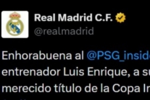 皇馬官方社媒也送上祝賀:“祝賀巴黎圣日耳曼俱樂部、主席納賽爾·阿爾赫萊菲、主帥路易斯·恩里克、球員以及所有球迷,你們完全配得上洲際杯冠軍?!?/p>