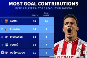 體育資訊12月18日訊 《轉會市場》統計了本賽季五大聯賽U19球員直接參與進球榜,亞馬爾無懸念領跑。