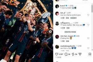 在巴黎身披7號的克瓦拉茨赫利亞社媒曬出捧杯照片,慶祝球隊奪冠,配文:“7是不錯的數(shù)字。”