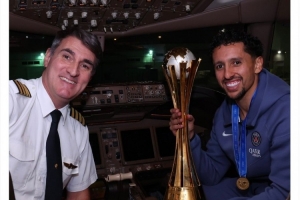 巴黎圣日耳曼球員們帶著獎杯乘坐飛機(jī)返回巴黎,俱樂部官方社媒曬出隊長馬爾基尼奧斯手拿獎杯與機(jī)長的合照,配文:“前往巴黎!”