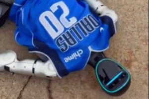 視頻中一個穿著獨行俠球衣的機器人正在施展回旋踢等招數,歐文溜過來使勁推了一把,機器人應聲倒地沒了動靜。